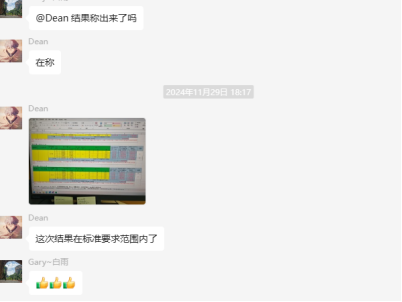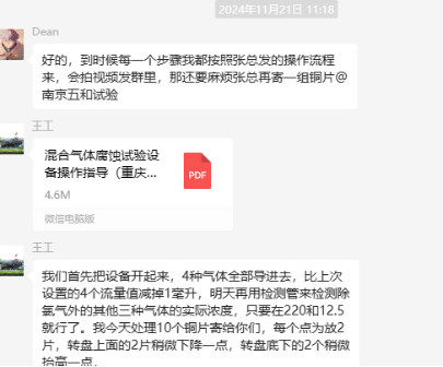 2024年8月份重慶******第三方檢測公司再次采購我司一臺型號為“WHQ-300B”型的混合氣體腐蝕試驗(yàn)箱,設(shè)備被運(yùn)送到客戶指定的場地安裝調(diào)試運(yùn)行。客戶后期自行進(jìn)行一次銅片增重試驗(yàn),起初試驗(yàn)結(jié)果不是很理想,,試驗(yàn)的流程和注意事項(xiàng)未了解透徹,我司針對以上信息,整理了操作指導(dǎo)作業(yè)書進(jìn)行幫助理解;通過理論知識和我司技術(shù)人員線上指導(dǎo)操作的配合,該增重試驗(yàn)很成功。試驗(yàn)結(jié)束之后客戶將數(shù)據(jù)發(fā)給我司,以下是客戶和我司聊天記錄以及客戶做的數(shù)據(jù)信息: